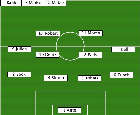 ------5 Marko-------------------- --Bank:-----12 Matze-------------- ----------17 Robert--11 Momo------ ---9 Julien-----------------7 Kolli ----------10 Deniz--8 Baris------- ---2 Böck----4 Simon-3 Tobias-6 Tusch ---------------1 Ante------------