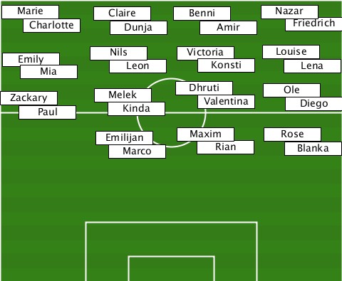 --Marie-------------------------- ----------Claire---Benni----Nazar-- ----Charlotte-Dunja---AMir-----Friedrich --Emily-Mia-Nils-Leon-Victoria-Konsti-Louise-Lena -Zackary-Paul-Melek-Kinda-Dhruti-Valentina-Ole-Diego ----------Emilijan-Marco-Maxim-Rian-Rose-Blanka