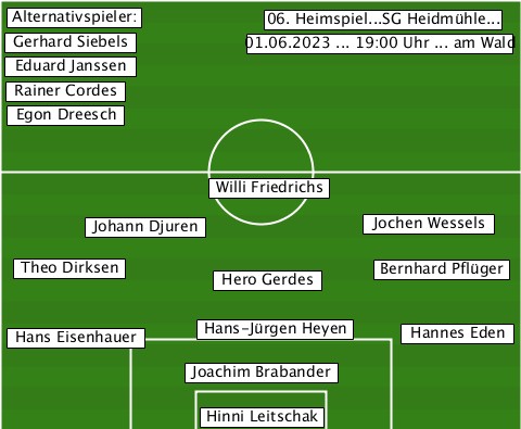 --Alternativspieler:------------- ------------------06. Heimspiel...SG Heidmühle... --Gerhard Siebels-01.06.2023 ... 19:00 Uhr ... am Wald --Eduard Janssen----------------- --Rainer Cordes------------------ --Egon Dreesch------------------- --------------Willi Friedrichs--- -------Johann Djuren-----Jochen Wessels --Theo Dirksen--Hero Gerdes-Bernhard Pflüger --Hans Eisenhauer-Hans-Jürgen Heyen-Hannes Eden -------------Joachim Brabander--- --------------Hinni Leitschak----