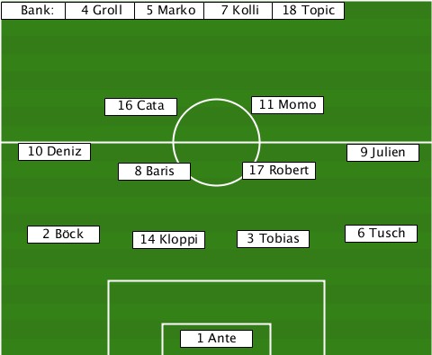 ------4 Groll-------------------- --Bank:-----5 Marko-7 Kolli-18 Topic ---------16 Cata-----11 Momo------ ---10 Deniz-----------------9 Julien ----------8 Baris---17 Robert----- ---2 Böck---14 Kloppi-3 Tobias-6 Tusch ---------------1 Ante------------