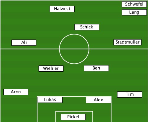----------------------------Schwefel ------------Halwest----------Lang- ------------------Schick--------- ----Ali--------------------Stadtmüller ----------Wiehler----Ben---------- --Aron----------------------Tim--- ----------Lukas------Alex--------- ---------------Pickel------------