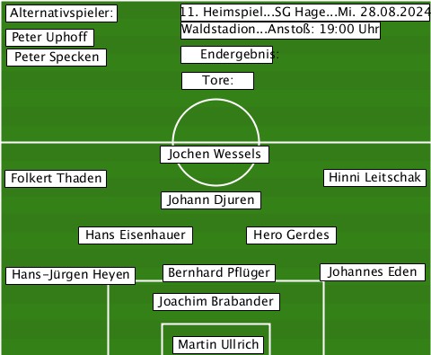 ---------------11. Heimspiel...SG Hage...Mi. 28.08.2024 --Alternativspieler:------------- --Peter Uphoff--Waldstadion...Anstoß: 19:00 Uhr --Peter Specken-Endergebnis:------ ---------------Tore:------------- -------------Jochen Wessels------ --Folkert Thaden----------Hinni Leitschak -------------Johann Djuren------- -------Hans Eisenhauer-Hero Gerdes --Hans-Jürgen Heyen-Bernhard Pflüger-Johannes Eden -------------Joachim Brabander--- --------------Martin Ullrich-----