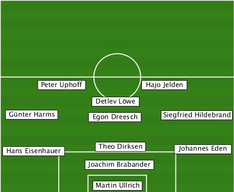 ---------------------Hajo Jelden- -------Peter Uphoff-------------- --------------Detlev Löwe-------- --Günter Harms-Egon Dreesch-Siegfried Hildebrand --Hans Eisenhauer-Theo Dirksen-Johannes Eden -------------Joachim Brabander--- --------------Martin Ullrich-----
