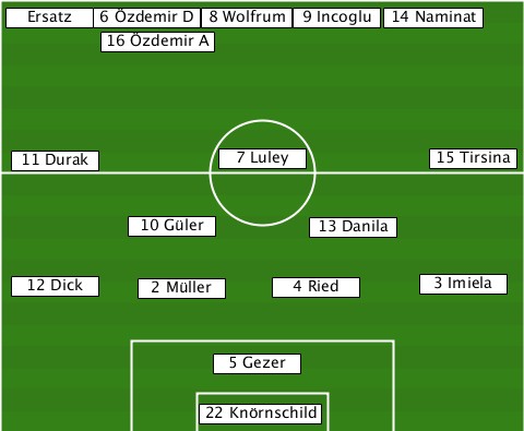 -------------------------14 Naminat --Ersatz-6 Özdemir D-8 Wolfrum-9 Incoglu --------16 Özdemir A------------- --11 Durak------7 Luley-------15 Tirsina ---------10 Güler----13 Danila---- --12 Dick--2 Müller-4 Ried----3 Imiela --------------5 Gezer------------ --------------22 Knörnschild-----