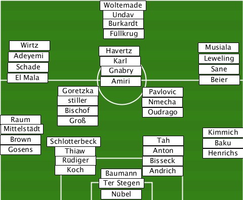 ---------------Woltemade--------- ---------------Undav------------- ---------------Burkardt---------- ---------------Füllkrug---------- --El Mala-Schade-Adeyemi-Wirtz-Havertz-Karl-Amiri-Gnabry-Musiala-Leweling-Sane-Beier ---------Goretzka----Pavlovic----- ---------stiller-----Nmecha------- ---------Bischof-----Oudrago------ -Raum-----Groß-------------------- -Gosens-Brown-Mittelstädt-Schlotterbeck-Thiaw-Rüdiger-Bisseck-Tah-Anton-Kimmich-Baku-Henrichs ---------Koch---Baumann-Andrich---- --------------Ter Stegen--------- ---------------Nübel-------------