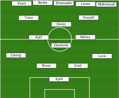 ----------Berke------------------ -----Kaan--------Emanuele-Lenni-Mahmoud ------Timo--------------Yousef---- ---------------Denis------------- ---------Ralf----------Niklas----- ---------------Dominik----------- ---Georg-------------------Luca--- -----------Rinor-----Emil--------- ---------------Kjell-------------