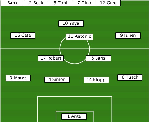 --Bank:-------------------------- -------2 Böck-5 Tobi-7 Dino-12 Greg- --------------10 Yaya------------ ----16 Cata------11 Antonio-9 Julien ----------17 Robert--8 Baris------ ---3 Matze--4 Simon--14 Kloppi-6 Tusch ---------------1 Ante------------