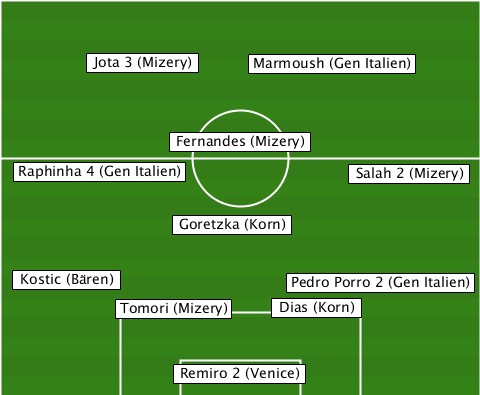 -------Jota 3 (Mizery)----------- ------------------Marmoush (Gen Italien) -------------Fernandes (Mizery)-- --Raphinha 4 (Gen Italien)-Salah 2 (Mizery) -------------Goretzka (Korn)----- --Kostic (Bären)------Pedro Porro 2 (Gen Italien) ---------Tomori (Mizery)-Dias (Korn) -------------Remiro 2 (Venice)---