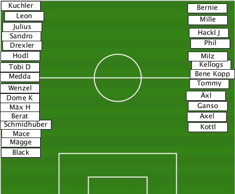 --Kuchler------------------------ ---------------------------Bernie --Sandro-Julius-Leon----------Mille-Hackl J --Drexler-------------------Phil-- --Hodl----------------------Milz-- -Tobi D-Medda-Wenzel----------Tommy-Bene Kopp-Kellogs -Dome K---------------------Äxl--- -Mäx H----------------------Ganso- -Berat----------------------Axel-- -Schmidhuber-Mace------------Kottl- --Mägge-------------------------- --Black--------------------------