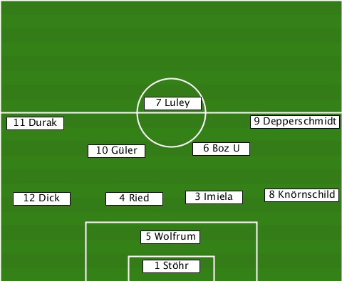 ---------------7 Luley----------- --11 Durak----------------9 Depperschmidt ----------10 Güler--6 Boz U------- ---12 Dick--4 Ried---3 Imiela-8 Knörnschild ---------------5 Wolfrum--------- ---------------1 Stöhr-----------