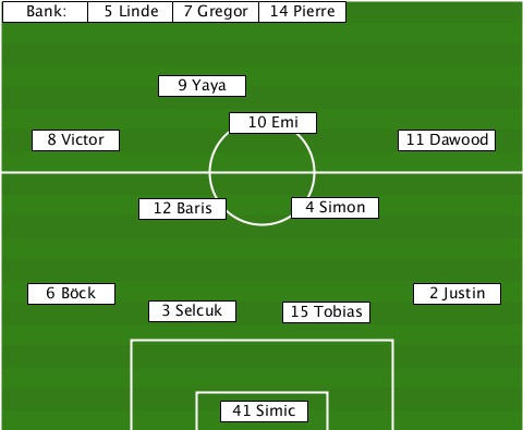 -------5 Linde------------------- --Bank:------7 Gregor-14 Pierre---- -----------9 Yaya---------------- ---------------10 Emi------------ ---8 Victor----------------11 Dawood ----------12 Baris--4 Simon------- ---6 Böck-------------------2 Justin -----------3 Selcuk-15 Tobias----- ---------------41 Simic----------