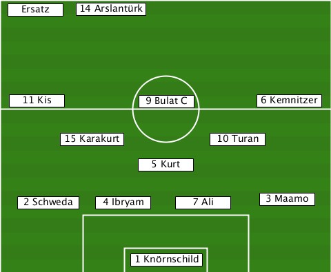 ---------14 Arslantürk----------- --Ersatz------------------------- --11 Kis--------9 Bulat C---6 Kemnitzer -------15 Karakurt-----10 Turan--- ---------------5 Kurt------------ ---2 Schweda-4 Ibryam-7 Ali---3 Maamo --------------1 Knörnschild------