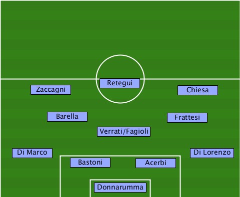 ---------------Retegui----------- ------Zaccagni------------Chiesa-- --------Barella----------Frattesi- --------------Verrati/Fagioli---- ---Di Marco-----------------Di Lorenzo -----------Bastoni---Acerbi------- --------------Donnarumma---------