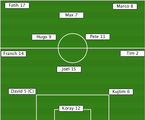 ---Fatih 17---------------------- --------------------------Marco 8 ---------------Max 7------------- --------Hugo 9-------Pete 11------ --Franch 14------------------Tim 2 --------------Joël 15------------ ---David 5 (C)------------Kujtim 6 --------------Koray 12-----------