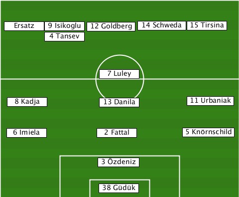 --------------------14 Schweda--- --Ersatz-9 Isikoglu-12 Goldberg-15 Tirsina -------4 Tansev------------------ ---------------7 Luley----------- --8 Kadja-------13 Danila---11 Urbaniak --6 Imiela-----2 Fattal-----5 Knörnschild ---------------3 Özdeniz--------- ---------------38 Güdük----------