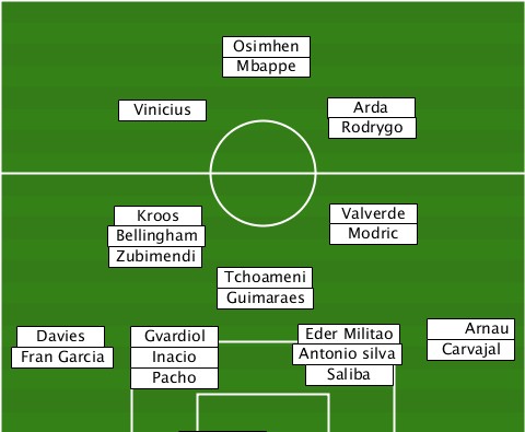 ---------------Osimhen----------- ---------------Mbappe------------ ---------Vinicius-----Arda-------- ---------------------Rodrygo----- --------Kroos----------Valverde--- --------Bellingham-----Modric----- --------Zubimendi---------------- ---------------Tchoameni--------- ---------------Guimaraes--------- --Fran Garcia-Davies-Gvardiol-Inacio-antonio silva-Eder Militao-Arnau-Carvajal ---------Pacho-------Saliba-------