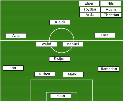 ----------------------alper------ ----------------------------Nils- ----------------------soydan-Adam- ----------------------Arda---Christian --------------Klajdi------------- ---Aziz--------------------Enes--- -----------Walid---Manuel--------- --------------Ersijon------------ --Ibo-----------------------Ramadan ----------Ruben----Mahdi---------- ---------------Kaan--------------