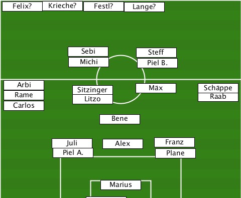 -------Krieche?------------------ --Felix?------Festl?-Lange?-------- ----------Sebi-------Steff-------- -----------Michi-----Piel B.------ --Arbi-Ramé-Carlos-Sitzinger-Litzo-Mäx-Schäppe-Raab ---------------Bene-------------- --------Juli----Alex----Franz------ --------Piel A.--------Plane------ ---------------Marius------------ -------------Bene----------------