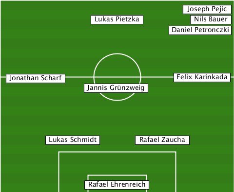 --------------------------Joseph Pejic --------------Lukas Pietzka-Nils Bauer -------------------------Daniel Petronczki --Jonathan Scharf---------Felix Karinkada -------------Jannis Grünzweig---- --------Lukas Schmidt-Rafael Zaucha -------------Rafael Ehrenreich---