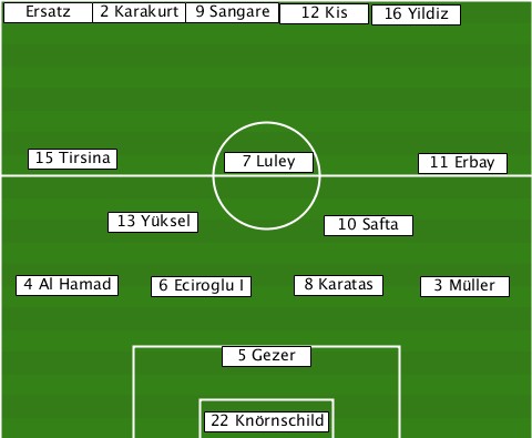 -------2 Karakurt---------------- --Ersatz------9 Sangare-12 Kis-16 Yildiz ---15 Tirsina---7 Luley------11 Erbay --------13 Yüksel-----10 Safta---- --4 Al Hamad-6 Eciroglu I-8 Karatas-3 Müller ---------------5 Gezer----------- --------------22 Knörnschild-----