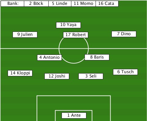 -------2 Böck-------------------- --Bank:------5 Linde-11 Momo-16 Cata --------------10 Yaya------------ ----9 Julien----17 Robert---7 Dino- ----------4 Antonio--8 Baris------ ---14 Kloppi-12 Joshi-3 Seli-6 Tusch ---------------1 Ante------------