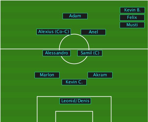 ---------------------------Kevin B. ---------------Adam---------Felix- ---------------------------Musti- ---------Alexius (Co-C)-Anel------ -----------Alessandro-Samil (C)--- ---------Marlon------Akram-------- ---------------Kevin C.---------- --------------Leonid/Denis-------