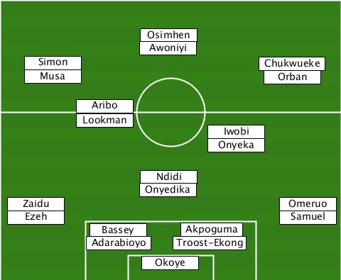---------------Osimhen----------- ---------------Awoniyi----------- ----Simon------------------Chukwueke ----Musa-------------------Orban-- ---------Aribo------------------- ---------Lookman----------------- ---------------------Iwobi------- ---------------------Onyeka------ ---------------Ndidi------------- ---------------Onyedika---------- --Zaidu----------------------Omeruo --Ezeh-----------------------Samuel ----------Bassey---Akpoguma------- ----------Adarabioyo-Troost-Ekong- ---------------Okoye-------------