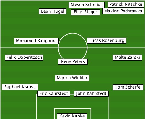 -------------------------Patrick Nitschke -----------------Steven Schmidt-- ----------Leon Hügel-Elias Rieger-Maxine Podstawka -----Mohamed Bangoura-Lucas Rosenburg ---Felix Doberitzsch-Rene Peters-Malte Zarski --------------Marlon Winkler----- --Raphael Krause-----------Tom Scherfel ----------Eric Kahrstedt-John Kahrstedt --------------Kevin Kupke--------