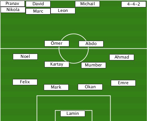 -Pranav-------------------------- -------David-------Michail----4-4-2 --Nikola-Marc-Leon----------------- -----------Ömer-----Abdo---------- ----Noel------------------Ahmad--- -----------Kartay---Mumber-------- ----Felix---Mark----Okan-----Emre--- ---------------Lamin-------------