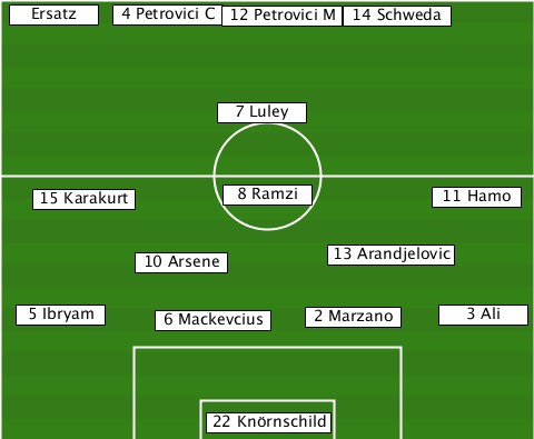 --Ersatz------------------------- --------4 Petrovici C-12 Petrovici M-14 Schweda --------------7 Luley------------ ---15 Karakurt--8 Ramzi------11 Hamo ----------10 Arsene---13 Arandjelovic --5 Ibryam--6 Mackevcius-2 Marzano-3 Ali --------------22 Knörnschild-----