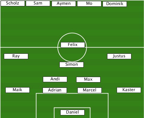 -------Sam----------------------- --Scholz------Aymen--Mo----Dominik-- ---------------Felix------------- --Ray---------------------Justus-- ---------------Simon------------- -----------Andi----Max------------ ---Maik-----Adrian---Marcel---Kaster ---------------Daniel------------