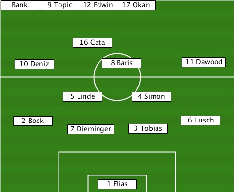 --Bank:-------------------------- -------9 Topic-12 Edwin-17 Okan---- -----------16 Cata--------------- ---10 Deniz-----8 Baris-----11 Dawood ----------5 Linde---4 Simon------- ---2 Böck------------------6 Tusch -----------7 Dieminger-3 Tobias--- ---------------1 Elias-----------