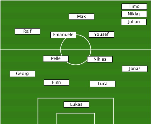 ---------------------------Timo-- ----------------Max---------Niklas ---------------------------Julian -----Ralf----Emanuele-Yousef------- -----------Pelle-----Niklas------- ---------------------------Jonas- ----Georg------------------------ -----------Finn-------Luca-------- ---------------Lukas-------------