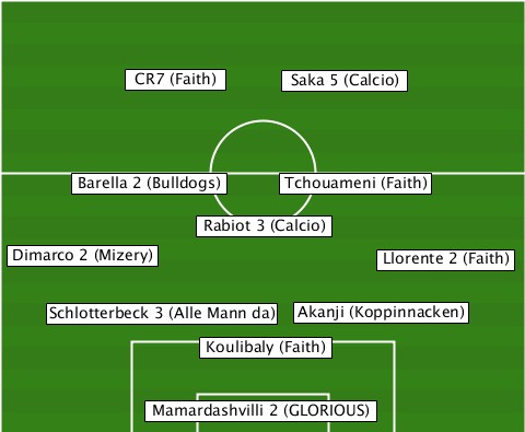 ---------CR7 (Faith)------------- -------------------Saka 5 (Calcio) ------Barella 2 (Bulldogs)-Tchouameni (Faith) -------------Rabiot 3 (Calcio)--- --Dimarco 2 (Mizery)-----Llorente 2 (Faith) ----Schlotterbeck 3 (Alle Mann da)-Akanji (Koppinnacken) --------------Koulibaly (Faith)-- ----------Mamardashvilli 2 (GLORIOUS)