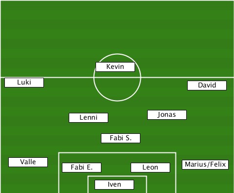 ---------------Kevin------------- --Luki----------------------David- -----------Lenni-------Jonas------ ---------------Fabi S.----------- ---Valle---Fabi E.---Leon----Marius/Felix --------------Iven---------------