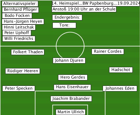 -------------14. Heimspiel...BW Papbenburg...19.09.2024 --Alternativspieler:------------- --Bernhard Pflüger-Anstoß 19:00 Uhr an der Schule --Hans-Jürgen Heyen-Bodo Focken-Hinni Leitschak-Endergebnis:-Tore: --Peter Uphoff------------------- --Willi Friedrichs--------------- ----Folkert Thaden-----Rainer Cordes --------------Johann Djuren------ ---Rüdiger Heeren----------Hadschot ---------------Hero Gerdes------- --Peter Specken-Hans Eisenhauer-Johannes Eden -------------Joachim Brabander--- --------------Martin Ullrich-----