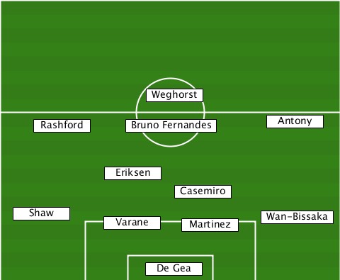 ---------------Weghorst---------- -----Rashford-Bruno Fernandes-Antony -----------Eriksen--------------- ------------------Casemiro------- ---Shaw-----Varane---Martinez-Wan-Bissaka ---------------De Gea------------