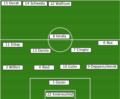 --15 Durak----------------------- --------14 Schweda-12 Wolfrum----- ---------------8 Imiela---------- --11 Erbay-------------------6 Boz ----------13 Danila--7 Cingöz----- --3 Wilfert-4 Ried-10 Güler-9 Depperschmidt ---------------5 Gezer----------- --------------22 Knörnschild-----
