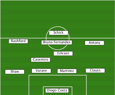 ---------------Schick------------ ----Rashford--Bruno Fernandes-Antony ----------------Eriksen---------- ----------Casemiro--------------- ---Shaw----Varane--Martinez-Clauss-- --------------Diogo Costa--------