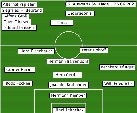 -----------------06. Auswärts SV Hage....26.06.2025 --Alternativspieler:------------- --Siegfried Hildebrand-Alfons Größ-Endergebnis: --Theo Dirksen-Tore:-------------- --Eduard Janssen----------------- ------Hans Eisenhauer-Peter Uphoff ------------Hermann Barrenpohl--- --Günter Harms------------Bernhard Pflüger --------------Hero Gerdes-------- --Bodo Focken-Joachim Brabander-Willi Friedrichs -------------Hermann Kemper------ --------------Hinni Leitschak----