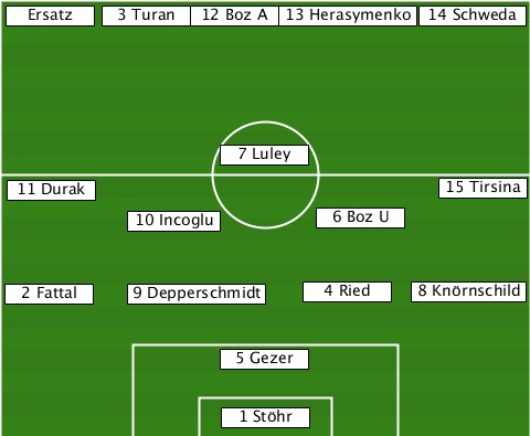 ---------------------------14 Schweda --Ersatz-3 Turan-12 Boz A-13 Herasymenko ---------------7 Luley----------- --11 Durak-------------------15 Tirsina ---------10 Incoglu---6 Boz U----- --2 Fattal-9 Depperschmidt-4 Ried-8 Knörnschild ---------------5 Gezer----------- ---------------1 Stöhr-----------