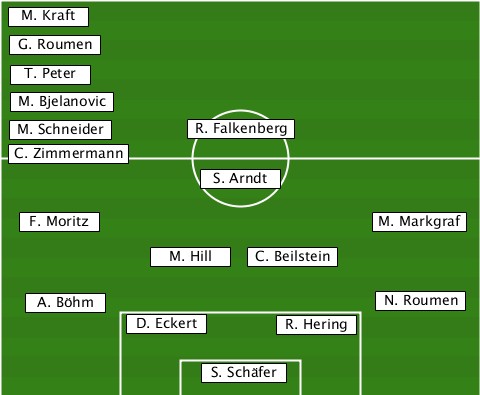 --M. Kraft----------------------- --G. Roumen---------------------- --T. Peter----------------------- --M. Bjelanovic------------------ --M. Schneider-R. Falkenberg------ --C. Zimmermann------------------ ---------------S. Arndt---------- ---F. Moritz---------------M. Markgraf -----------M. Hill-C. Beilstein--- ---A. Böhm-----------------N. Roumen ----------D. Eckert--R. Hering---- ---------------S. Schäfer--------