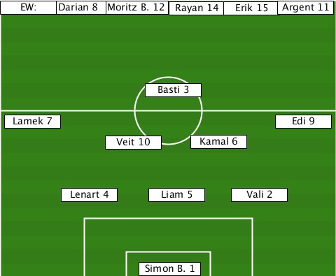 -----------Moritz B. 12---------- -EW:---Darian 8-----Rayan 14-Erik 15-Argent 11 ---------------Basti 3----------- --Lamek 7--------------------Edi 9 -----------Veit 10---Kamal 6------ -------Lenart 4--Liam 5--Vali 2---- ---------------Simon B. 1--------