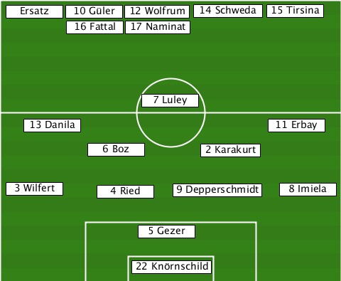 --------------------------15 Tirsina --Ersatz-10 Güler-12 Wolfrum-14 Schweda --------16 Fattal-17 Naminat------ ---------------7 Luley----------- ----13 Danila---------------11 Erbay ----------6 Boz------2 Karakurt--- --3 Wilfert-4 Ried--9 Depperschmidt-8 Imiela --------------5 Gezer------------ --------------22 Knörnschild-----