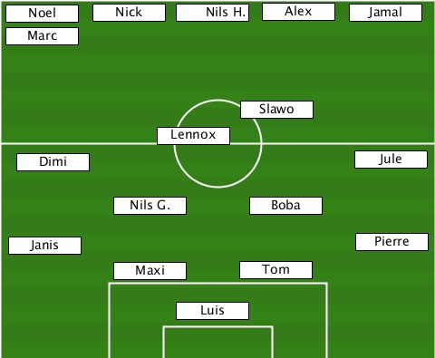 ---------------------Alex-------- --Noel---Nick---Nils H.-------Jamal- --Marc--------------------------- -------------------Slawo--------- -------------Lennox-------------- ---Dimi----------------------Jule- ----------Nils G.----Boba--------- --Janis----------------------Pierre ----------Maxi------Tom----------- --------------Luis---------------