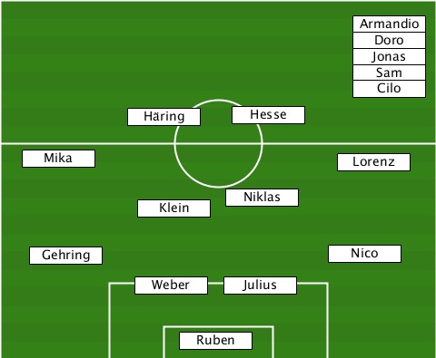 ---------------------------Armandio ---------------------------Doro-- ---------------------------Jonas- ---------------------------Sam--- ---------------------------Cilo-- -----------Häring--Hesse---------- ---Mika--------------------Lorenz- ------------Klein--Niklas--------- ----Gehring----------------Nico--- -----------Weber---Julius--------- ---------------Ruben-------------