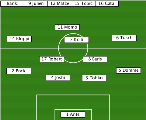 ----------------------16 Cata---- --Bank:-9 Julien-12 Matze-15 Topic-- --------------11 Momo------------ ---14 Kloppi-----7 Kolli----6 Tusch ----------17 Robert--8 Baris------ ---2 Böck-------------------5 Domme -----------4 Joshi--3 Tobias------ ---------------1 Ante------------