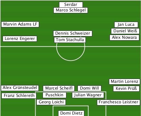 ---------------Serdar------------ --------------Marco Schlegel----- --Marvin Adams LF-----------Jan Luca --Lorenz Engerer-Dennis Schweizer-Tom Stachulla-Alex Nowara-Daniel Weiß --------------------------Martin Lorenz --Alex Grünsteudel-Marcel Scheifl-Domi Will-Kevin Prüß --Franz Schlereth-Puschkin-Julian Wagner ----------Georg Loichi--Franchesco Leistner ---------------Domi Dietz--------
