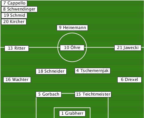 --7 Cappello--------------------- --8 Schwendinger----------------- --19 Schmid---------------------- --20 Kircher--------------------- --------------9 Heinemann-------- --13 Ritter-----10 Öhre------21 Jawecki ---------18 Schneider-4 Tschemernjak --16 Wachter-----------------6 Drexel ---------5 Gorbach-15 Teichtmeister ---------------1 Grabherr--------