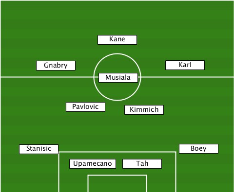 ---------------Kane-------------- ------Gnabry-------------Karl----- ---------------Musiala----------- ----------Pavlovic-Kimmich-------- ----Stanisic---------------Boey--- -----------Upamecano-Tah----------